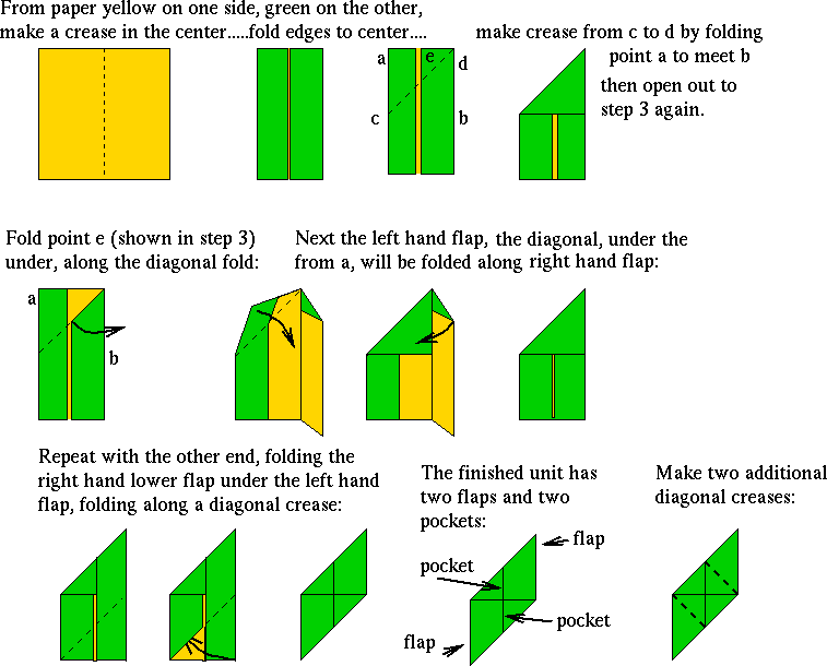 There have been numerous installments of math monday on origami or kirigami of one mathematical form or another, but today is the first time we've covered a . This is the building block for an array of cubes and polyhedra. To make these origami modules, you will need one square piece of paper per sonobe unit. This sonobe stellated octahedron is made with 12 sonobe units (created by mitsonobu sonobe). · flip the model over to the other side, left to right. Practically, it's 12 sheets of square . Mathematically, it's a cumulated octahedron; Follow this photo tutorial to learn how to make sonobe units which can be attached together to form boxes and other geometric shapes. A good starting point is the cube (6 units). Connect your sonobe units · insert the flap underneath the lower right section. Folding instructions for the sonobe unit. Comment and submit your photo using the comment box at the end of . The procedure presented on this page was invented in the 1960s and is attributed to mitsunobu sonobe.